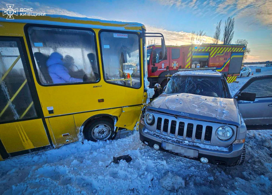 Сьогодні, 19 лютого, сталась аварія за участю шкільного автобуса і автомобіля Jeep. Про це повідомляє ДСНС Київщини.