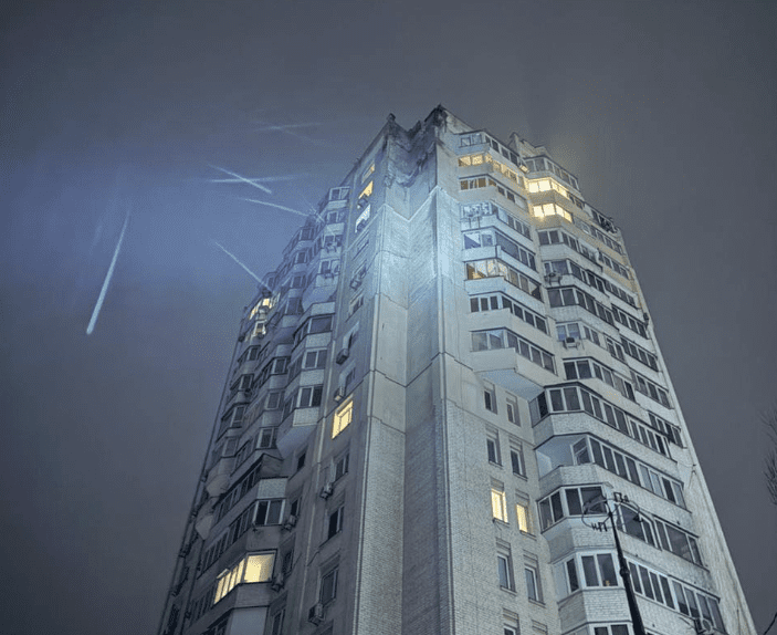 У ніч на 28 січня ворожі БпЛА вчергове атакували Київ. Безпілотник поцілив у технічний поверх 17-поверхового будинку в Голосіївському районі. Обійшлось без постраждалих. Пошкоджено фасад будинку, вікна та автомобілі.