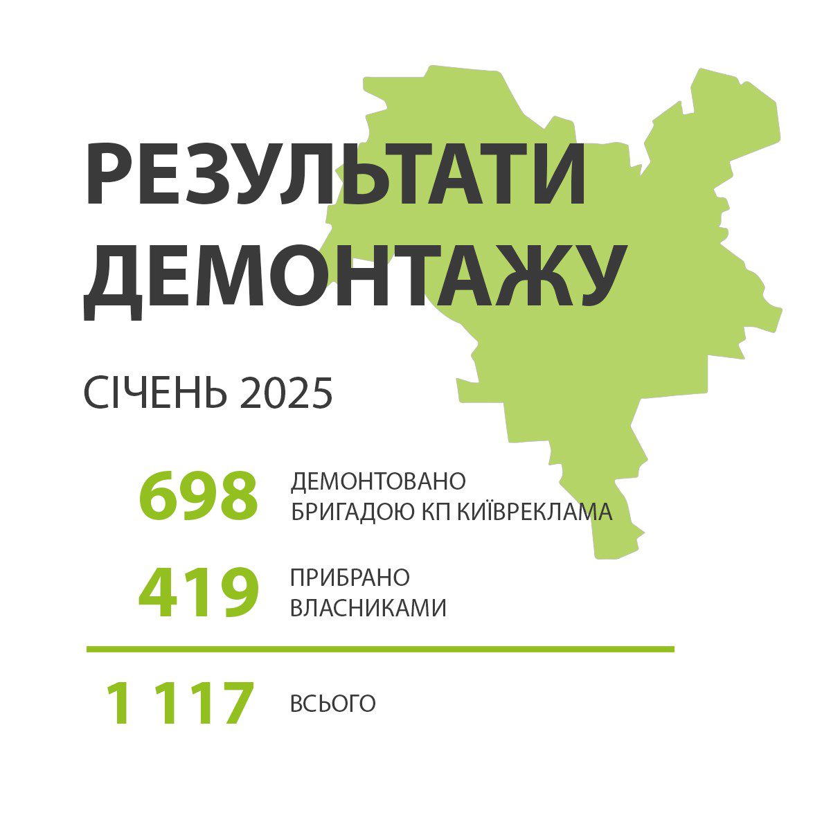 За даними Управління з питань реклами КМДА, у січні в столиці демонтували 1117 рекламних конструкцій та вивісок, розміщених із порушенням вимог чинного законодавства та Правил благоустрою міста Києва.